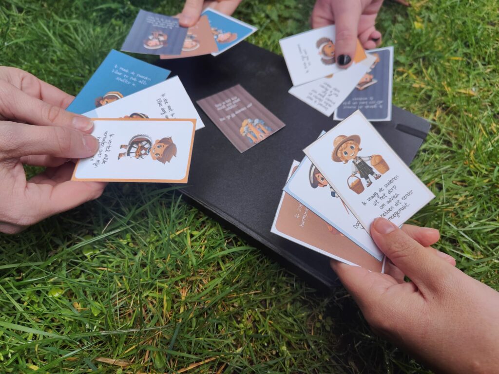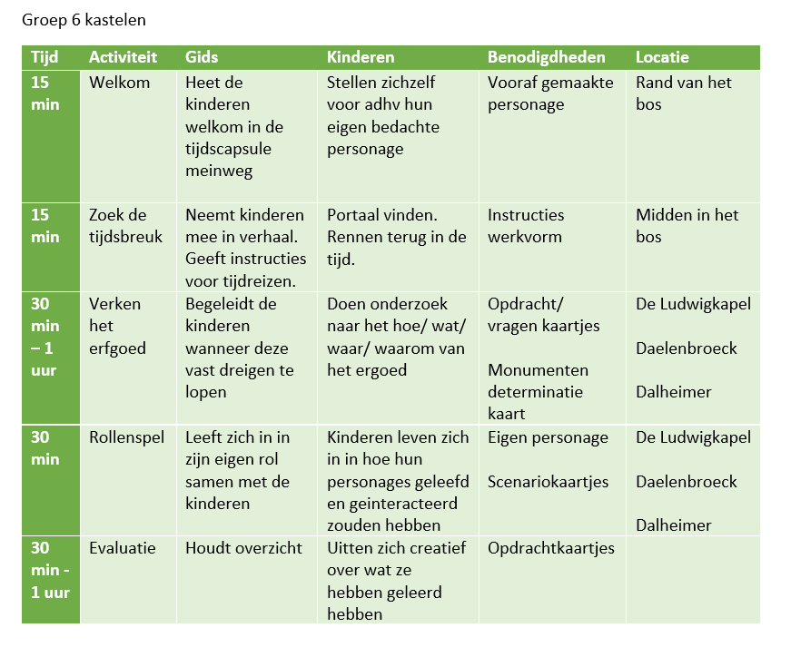 De kinderen komen elk steeds een dagdeel naar de Meinweg en worden meegenomen in een immersive storytelling ervaring. Gedurende het programma worden de vier stappen van “flowlearning” gevolgd. Dit begint met een energizer, een activiteit om de aandacht te focussen. Gevolgd door een activiteit waarin ruimte is om eigen ervaringen op te doen. Waarna er in de laatste fase nog gereflecteerd wordt. Ook wordt een creatief proces doorlopen in vier fases: Oriënteren, onderzoeken, uitvoeren en evalueren. Gedurende drie jaar leren kinderen zich te “realiseren dat cultureel erfgoed betrekking heeft op thema’s en tijdvakken uit wereldoriëntatie”, krijgen ze een “historisch besef in relatie met het cultureel erfgoed” en worden ze zich “bewust van het belang van behoud van historische bronnen en van bronnen van nu voor de toekomst”. Hierdoor kan na drie jaar voldaan worden aan kerndoel 56 van kunstzinnige oriëntatie. Namelijk dat “de leerlingen enige kennis verwerven over en waardering krijgen voor aspecten van cultureel erfgoed” De rol van het kind en van de gids zijn duidelijk vermeld in een programmaboekje en werkvormen. Evenals de te behalen doelen en bijbehorende opdrachten. Het verhaal rond het programma speelt in op de culturele geschiedenis van het park. Namelijk de Meinweg als goed bewaarde tijdcapsule. Waarin kinderen elk jaar afreizen naar een nieuwe belangrijke tijd van het cultureel erfgoed. Je ziet de verhaallijn terugkomen in verschillende activiteiten gedurende het dagdeel. Er zijn drie thema’s; kastelen, IJzeren Rijn en de tweede Wereldoorlog. De overkoepelende verhaallijn is de Meinweg als goed bewaarde tijdcapsule. De programma’s zijn in de vorm van een draaiboek en werkvormen. De boekjes worden aangevuld met lesmateriaal dat de gids gedurende de dag nodig heeft en hebben nog een interactief voorprogramma voor de kinderen. Waarmee zij in de klas al ondergedompeld worden in de Meinweg als tijdcapsule. Het voorprogramma voor de kastelen in een kaartspel dat de kinderen in een half uur in de klas kunnen spelen. Het doel van dit kaartspel is het bepalen van de rol die het kind mee kan nemen naar de Meinweg. Met deze rol zullen ze volgens de verhaallijn niet opvallen in het verleden van de Meinweg. De kinderen kunnen zich inleven in deze rol. Het spel bestaat uit een set scenario kaartjes en reactie kaartjes. Elk kind heeft 3 reactie kaartjes vast. Wanneer er een scenario kaartje op tafel ligt kunnen de kinderen elk 1 kaartje opgooien om te reageren waarna ze een nieuw kaartje van de stapel mogen pakken. Dit gaat door tot de scenario kaartjes op zijn. De rollen van de reactie kaartjes worden per kind geteld. Heeft een kind drie ridders, een bediende en twee kunstenaars opgegooid dan krijgt dit kind de rol van ridder.