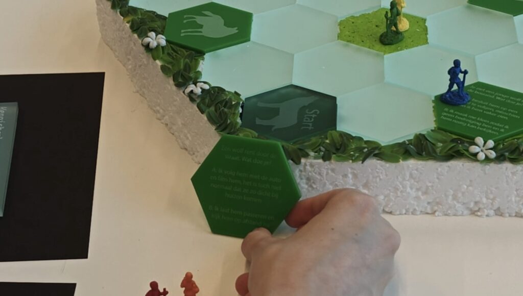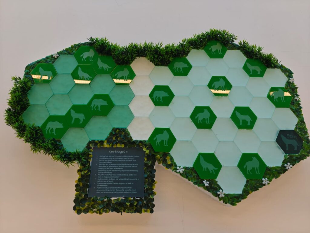 Ik begon mijn onderzoek met het doel meer begrip te kweken voor de wolf en zijn natuurlijke gedrag. Maar ik merkte al snel dat mensen het eigenlijk niet zo veel boeit en het voor hen pas interessant wordt wanneer een wolf in probleemgedrag vervalt, maar op dat punt is er nog weinig begrip op te brengen. Nee ik heb gemerkt dat mensen veel sneller geneigd zijn begrip te tonen wanneer hun eigen handelen centraal staat en niet dat van de wolf. Het probleemgedrag van de wolf is het gevolg van aangeleerd gedrag door mensen. Ik was dus op zoek naar een manier om mensen dat duidelijk te maken, zodat zij gaan nadenken over het samenleven met wolven en bewustere keuzes in de natuur maken. Na een lang onderzoekproces is er de volgende ontwerpvraag uitgekomen: Hoe kunnen bezoekers van natuurgebieden waar wolven leven aan het denken worden gezet over de rol die de mens speelt in het wolvenprobleem, en hoe kunnen we hen op een laagdrempelige en speelse manier prikkelen om te reflecteren op hun eigen gedrag en de mate waarin dat gedrag al dan niet bijdraagt aan het ontstaan van probleemwolven middels een critical design in de vorm van een bordspel.